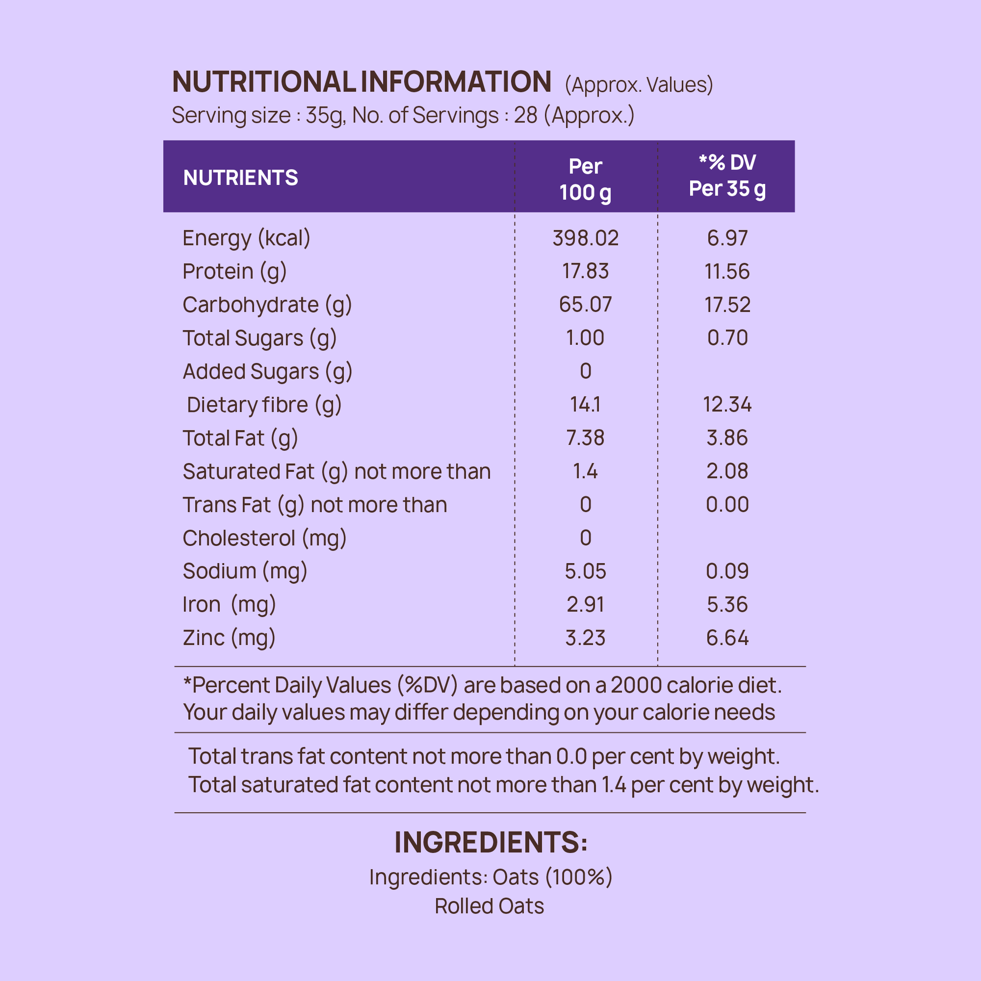 Made from 100% wholegrain oats, which is a natural source of protein and dietary fibre that helps in weight management. A versatile product, can be used for making healthy and tasty dishes - dosas, idlis, upmas, porridges and much more.