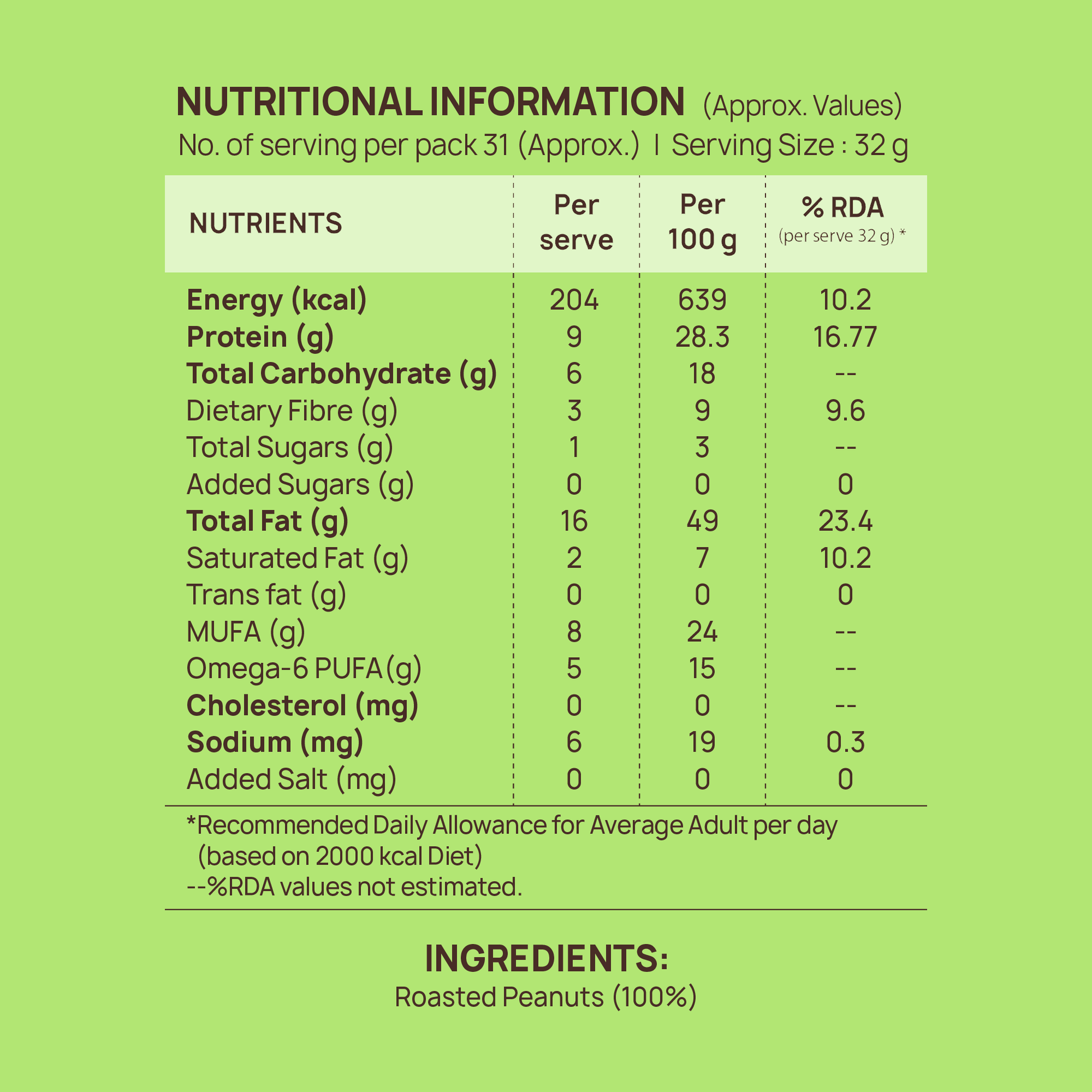 Made with 100% premium roasted peanuts only. With absolutely No Added sugar, salt or hydrogenated oil.